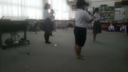 リコーダーで「陽気な船長」「オーラリ」を、そのあと、様々な楽器で「茶色のこびん」を合奏しました。