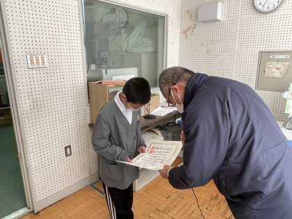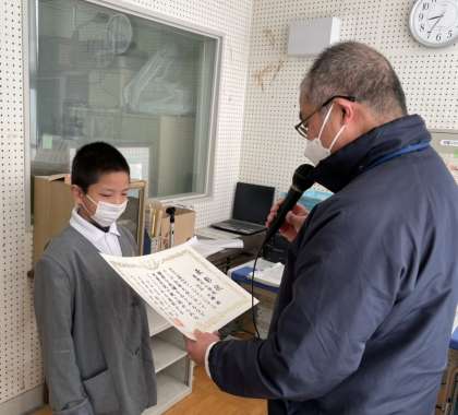 2月最後の児童朝会。今日はたくさんの人の表彰伝達が行われました。まずは、ボクシングで日本一となり、大阪市長賞を受賞した3年生が紹介されました。