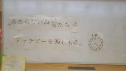 毎週水曜日はあゆみタイム。本日、第1回目のあゆみタイムを講堂で行いました。今日のめあては、「新しいお友達とドッジビーを楽しもう」です。