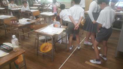 そして、巻き尺を使って実際に教室の長さを測っています。