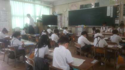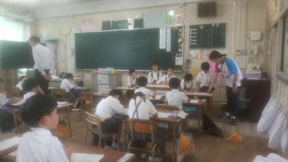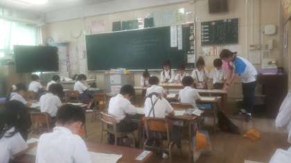 宿題の答え合わせをやつています。係の人達が前に出て、進めている姿に感動しました。どんどん成長している1年生!