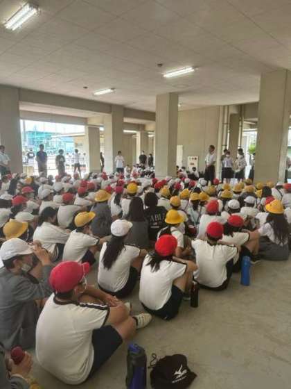 校長先生の話を静かに聞いて、その後生徒会より説明を聞いています。