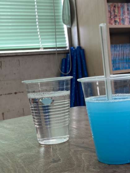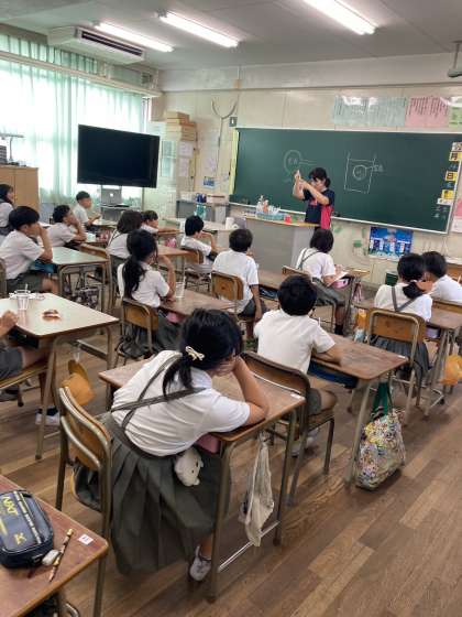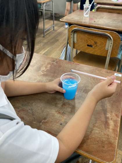 水中でシャボン玉を作る実験です。今日は1組で行われました。上手にできたかな?