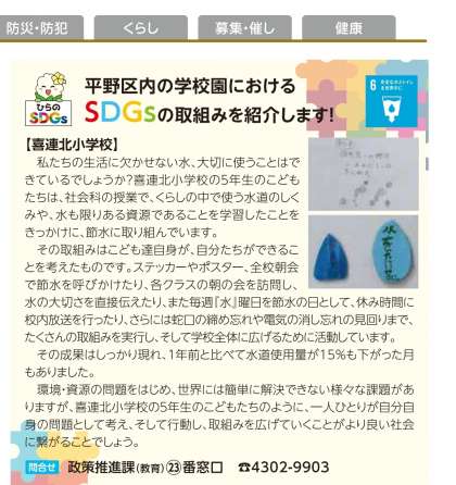 平野区広報紙「広報ひらの」9月号に、5年生の節水・節電運動が記事に取り上げられました。広報紙は、平野区全戸配布されております。ぜひ、ご一読下さい。