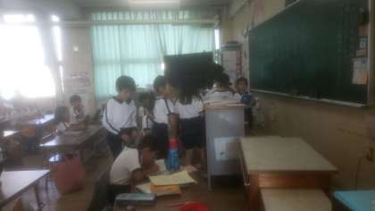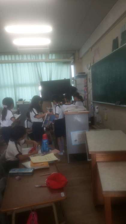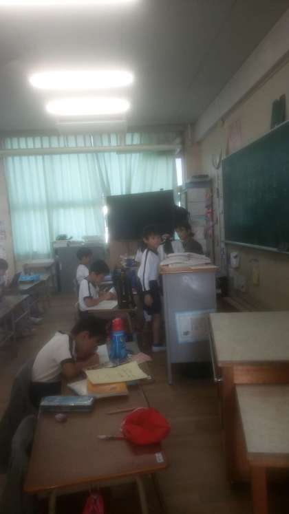 漢字練習中です。出来た人から先生の前に並んでいます。「合格できるかな?」ドキドキしながらの順番待ちです。