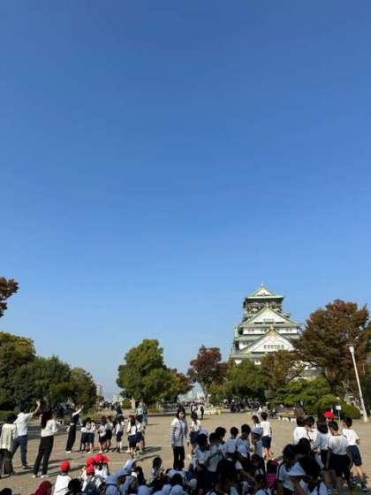 美味しいお弁当を食べて、大阪城を背景にクラス写真を撮っています。
