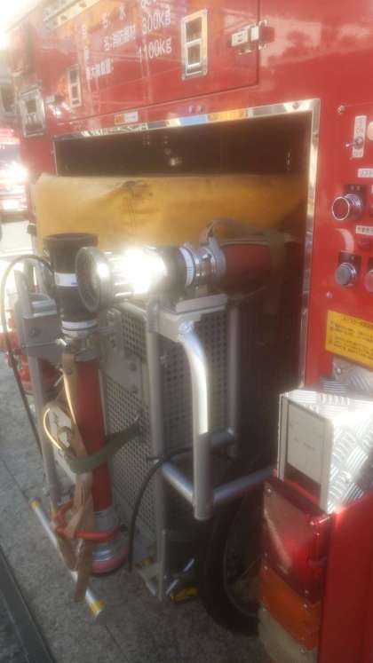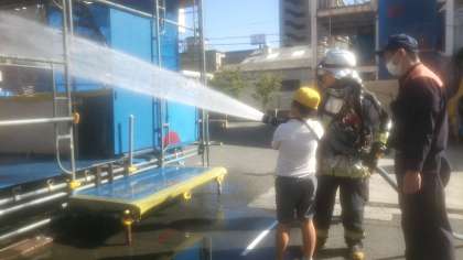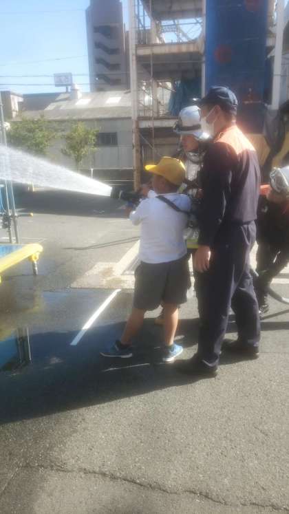 実際にホースを持って、消火訓練を体験させて頂きました。気持ちはみんな、消防士です!