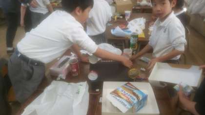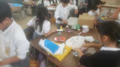 色々な箱を組み合わせて、グループで協働しながら作品を作っています。どのような形にすれば、よく転がるのかを体験を通して学んでいます。