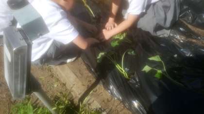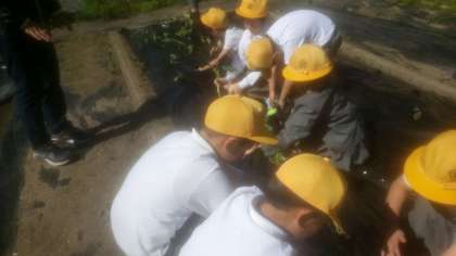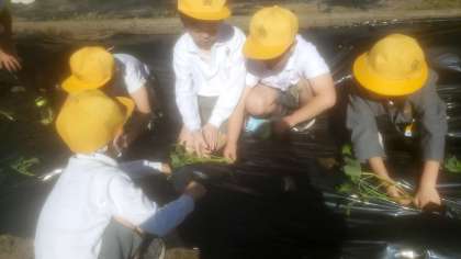 学習園をのぞいてみると、2年生が何かを植えていました。何を植えているのか聞いてみると、「さつまいも」とのこと。秋には大きな大きなさつまいもが収穫できるといいですね。