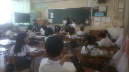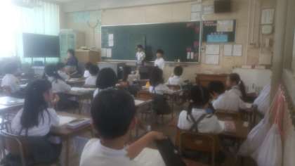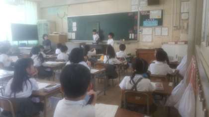 日直さんが前に出て、スピーチをしています。それに対して聞いている人たちが質問をします。話し合い活動の基本を少しずつ学んでいます。