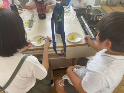 出来上がりです。みんなで協力して作った料理の味はどうですか?今回の調理実習で身につけた知識や技能を活かして、是非お家でもやってみよう!