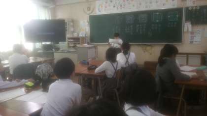 みんなに紹介したいことを作文にまとめました。今日は全員の前で発表したり、グループで相互評価をしたりしています。