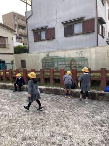 3学期に学習する「大阪市の移り変わり」の学習に備えて、今日は古い街並みや遺物が残る地域に見学に行きました。画像は、かつてあった南海電鉄平野線の平野駅付近です。