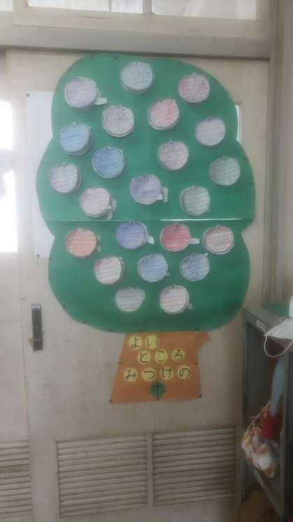 クラスの友達に書いてもらったたくさんの「いいとこみつけ」カードを台紙に貼っていきます。