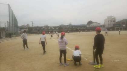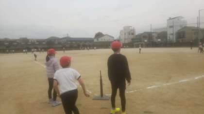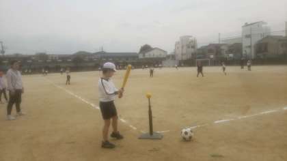 ティーバッティングベースボール。今日はクラス対抗で行いました。得意な人が苦手な人に優しく教える姿がたくさん見られました。