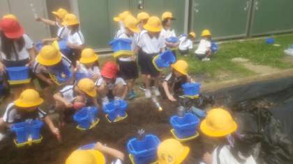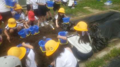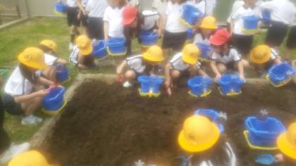 これから朝顔を一人一鉢で育てていきます。まず今日は土を入れて種を植えます。