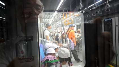 子ども専用列車に乗って会場に向かってます。他のお客さんは乗れないのでゆったりしてます。