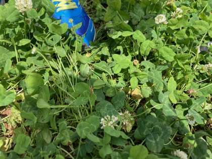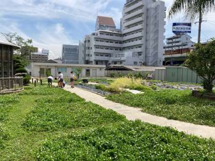 中庭で虫探しをする四年生