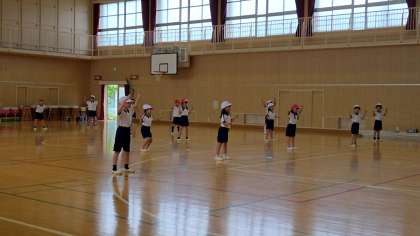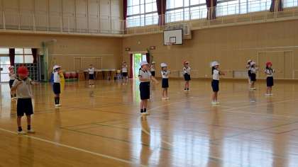 軽快な音楽に合わせて準備体操に取組んでいました。