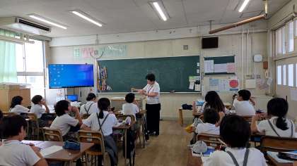 これから行うメダカの観察の仕方について、先生から説明を受けています。