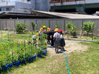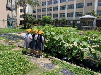 その後、ひまわりと背比べしました。一年生より大きくなっているひまわりもあります。