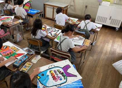 絵の具で描いた線の間に、クレパスで色を塗っていきます。段々と世界に一匹だけの魚が仕上がっていきます。