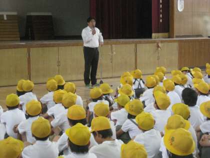 今朝は児童集会を行い、校長先生の講話がありました。喜連北小学校ができたころは、学校のすぐ近くに走っている高速道路が建設中でした。