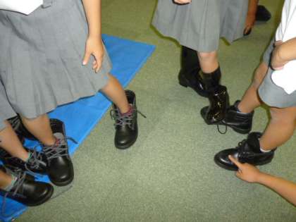 パッカー車の事やごみ収集時に流れる音楽について教えてもらった後、ごみ収集時の作業服や靴・手ぶくろを身につけさせてもらいました。靴の先には鉄板がしこまれており、どんなにふんでも痛くなく、子どもたちはびっくり。最後にはクラス対抗ごみ分別ゲームで大盛り上がりでした。お土産にペットボトルをリサイクルしてできたものさしをいただきました。とても楽しく勉強になった出前授業でした。