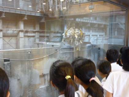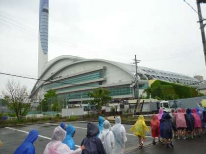 雨の中でしたが、40分くらいしっかりと歩いて平野焼却工場へいきました。実際に6mもの大きさのごみクレーンでごみをすくっている様子を見たり、見学したことをもとにしたクイズに答えたりして、楽しみながら学習することができました。