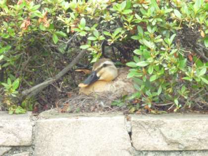 6月の下旬頃に喜連北小学校の庭の池の植え込みのところに、カモの卵があるのを発見!お母さんのカモが毎日、雨の日も風の日も一生懸命大事に卵をあたためています。卵がかえって親子のカモを見られるのが、今からとても待ち遠しいです。おどろかさないようにみんなやさしくみまもってね!