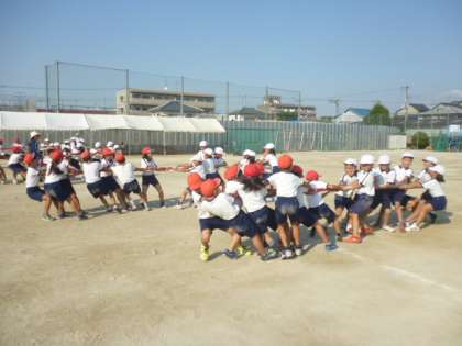 4年生の団体競技は棒引き「力を合わせて」です。赤と白に分かれて、棒を力いっぱいひっぱりあいます。最後まであきらめず、本番もがんばろう!