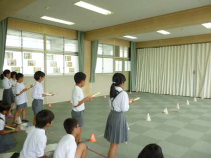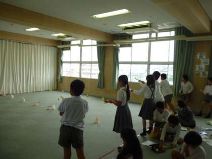 4年生では「とじこめた空気や水」の学習をしています。とじこめた空気をおすとどうなるか、という学習で「空気てっぽう」のセットで実験をしました。「ポン」と大きな音をたてて球がよく飛んだ時には喜んでいた子どもたちでした。