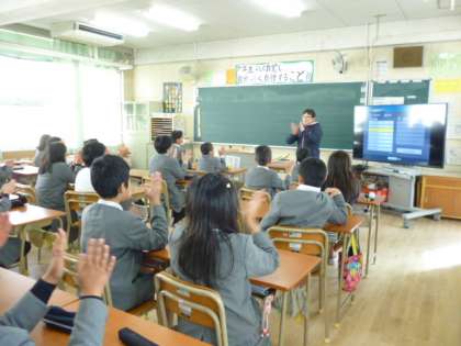 6年生の英語学習の様子です。音楽がかかると元気いっぱいの歌声が聴こえてきました。アルファベットの歌を歌ったり、ストーリーを学んだり、アルファベットの歌に合わせて2人組で手を合わせあい、曲がスピードアップするほど盛り上がったりと、楽しい英語学習でした。