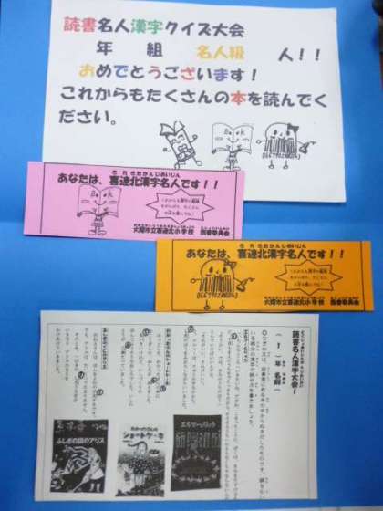 12月11日(月)の朝会で、読書名人漢字クイズ大会の表彰をしました。読書名人漢字クイズ大会は、図書委員会が「すすんで読書をするようになってほしいな。そのために、漢字の力をつけていかなければいけないな。」という意見を出したことをもとに行われることになりました。読書名人漢字クイズ大会の問題は、喜連北小学校の図書室にある本から出題されました。全問正解者は、「名人級」として手作りの名人級カードが配られました。各学級でたくさん名人級がいました。これからも、たくさんの本を読んでほしいです。