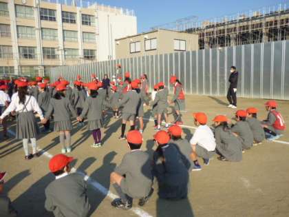 12月7日(木)は全校たてわり集会でした。たてわりのみんなで手をつなぎ、「フラフープリレー」をしました。手は離さないルールです。体をくねらせながらとなりの人にフラフープを渡します。後ろまでフラフープが届き、前まで戻るとゴールです。みんなで声をかけながら、早くゴールできるよう頑張っていました。寒い中でしたが、楽しい集会でした。