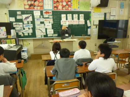 1月19日(金)2.3時間目に栄養教諭の先生に4年1組、4年2組で栄養学習をしていただきました。学校給食に登場する魚の名前を写真を見ながらみんなで思いだしたり、魚を食べるとどんなよいことがあるのか考えたりして楽しく学習できました。骨や歯をじょうぶにする魚パワー。頭の働きをよくする魚パワー。血の流れをよくする魚パワー。3つの魚パワーについて学びました。