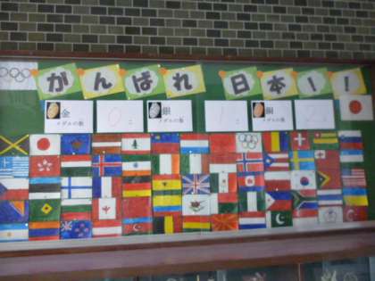2月の玄関掲示は2年生の担当で、今開催されているオリンピックで日本を応援する掲示物となっています。世界各国の国旗が子ども達の手で、一生懸命描かれ、オリンピックを盛り上げてくれています。今日は日本が取ったメダルの数が掲示されました。金、銀、銅、とたくさんのメダルがとれるといいですね。