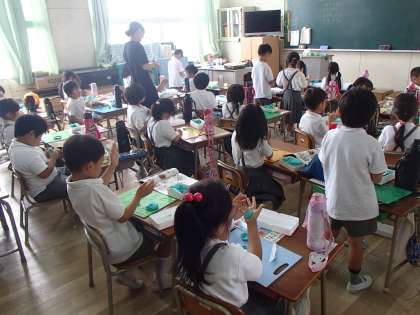 あたりまえの風景ですが、学校での授業。とっても楽しそうな場面に出合います。今回の紹介は、1年生の図工「みてみていっぱいつくったよ」の時間と、図書読み聞かせボランティア『お話宝箱』さんによる6年生への読み聞かせの時間です。子どもたちは粘土工作も、絵本のお話も大好きです。