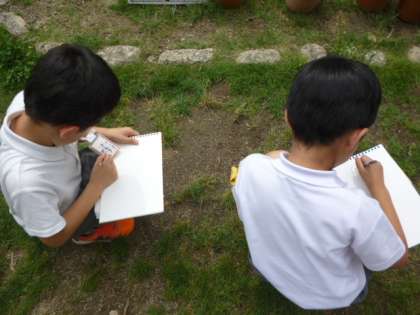 生活科「なにがみつかるかな?」の学習で、中庭や学習園で見つけて草花や虫を描きました。ダンゴムシやうさぎ、シロツメ草などたくさんのものを見つけることができました。新しい発見はあったかな・・・