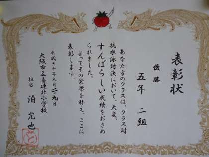 5年生最後のプール水泳は、クラス対抗水泳大会をしました。たくさんの種目があり、クラスで力を合わせみんな一生懸命大会に参加していました。今回は接戦の末、2組の勝利に終わりましたが、2クラスとも全力を尽くして、とてもよい雰囲気で最後まで盛り上がりました。