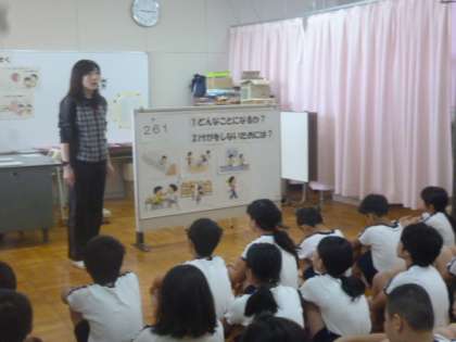 11月7日(水)、4年生が体重測定を行いました。木村先生からは学校でのけが人の数についての話があり、その多さに子ども達もびっくりしていました。その後、絵を見て、どんなけがになるか、けがをしないようにするための方法についてグループで話し合いました。