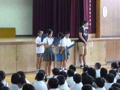 始業式では、まず『児童代表のことば』として4年生代表委員の4人から夏休みの経験や二学期に向けての発表をしました。そのあと、校長先生から2学期も様々行事など、みんなで力を合わせてがんばりましょうとお話があり、最後に大きな声で校歌を歌いました。