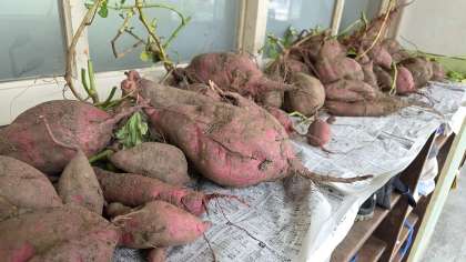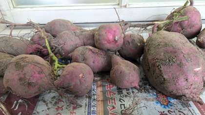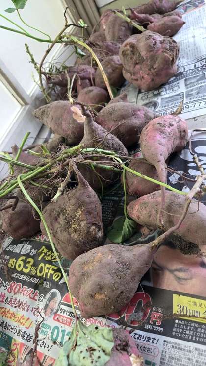 収穫の時期を迎えました。今年は例年よりも大きなサツマイモが沢山出来ましたね。この後は、ツルなども使って秋祭りをするそうです。