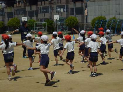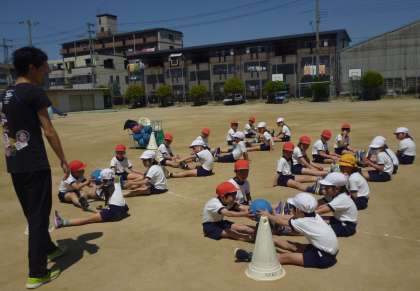 体づくりの体操や、協力してボールを運ぶリレーなど、楽しみながら運動していました。