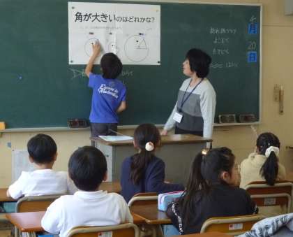 子どもたちは、自分のはさみや定規を使って角の大きさを比べ、見つけた結果を発表していました。