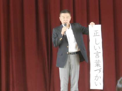 この日の朝会では、校長先生から子どもたちに向けて、「正しい言葉づかいを心がけることで、みんなが安心して気持ちよく生活できるようになります。みんなの力でいじめのない学校にしていきましょう!」という話がありました。