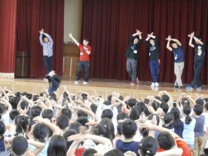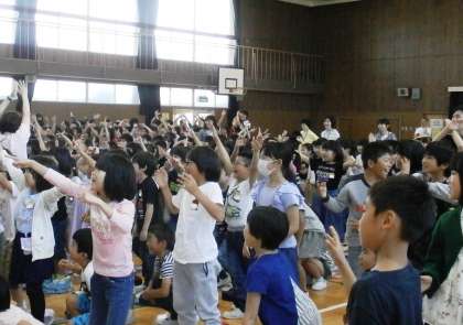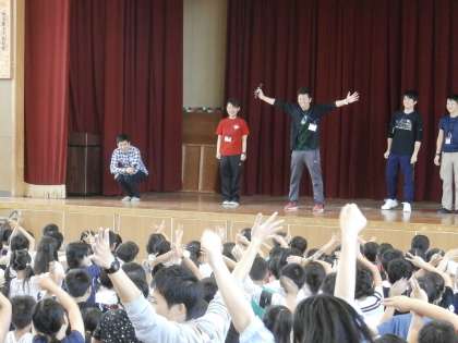 ステージの先生たちとのじゃんけんに、勝ったり負けたりするたび、子どもたちは大盛り上がり。
