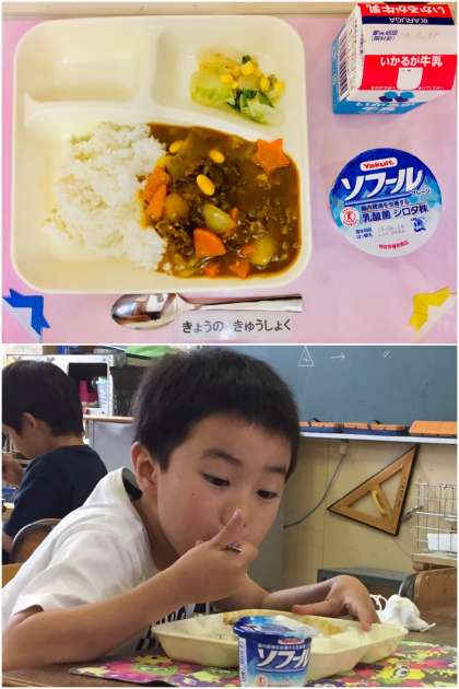牛肉と大豆のカレーライスには、水煮の大豆を使っています。コクのあるカレーライスと大豆を合わせると、大豆の甘味やおいしさが引き立ち、豆が苦手な子どもたちにも食べやすかったようです。