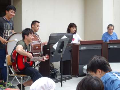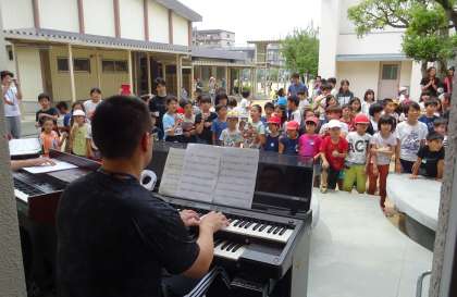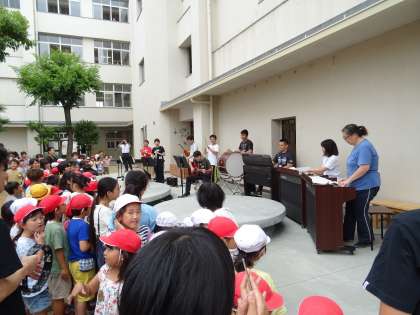 加美東小学校の創立記念日(6月6日)のお昼休みに中庭演奏会をおこないました。