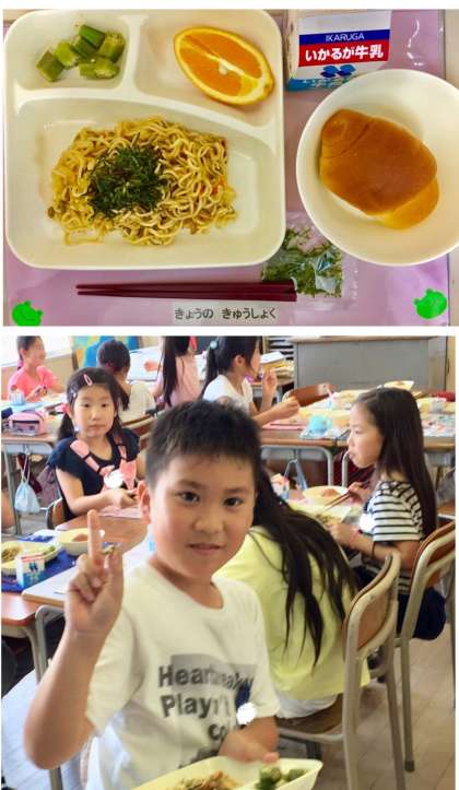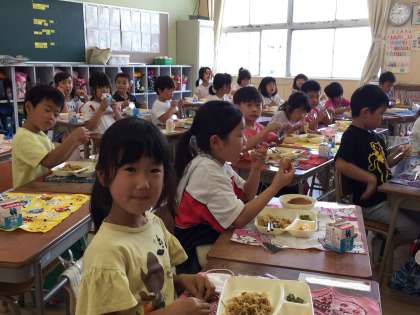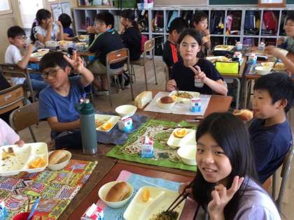 他のクラスの子どもたちと、半数ずつ入れ替わって給食を食べました。